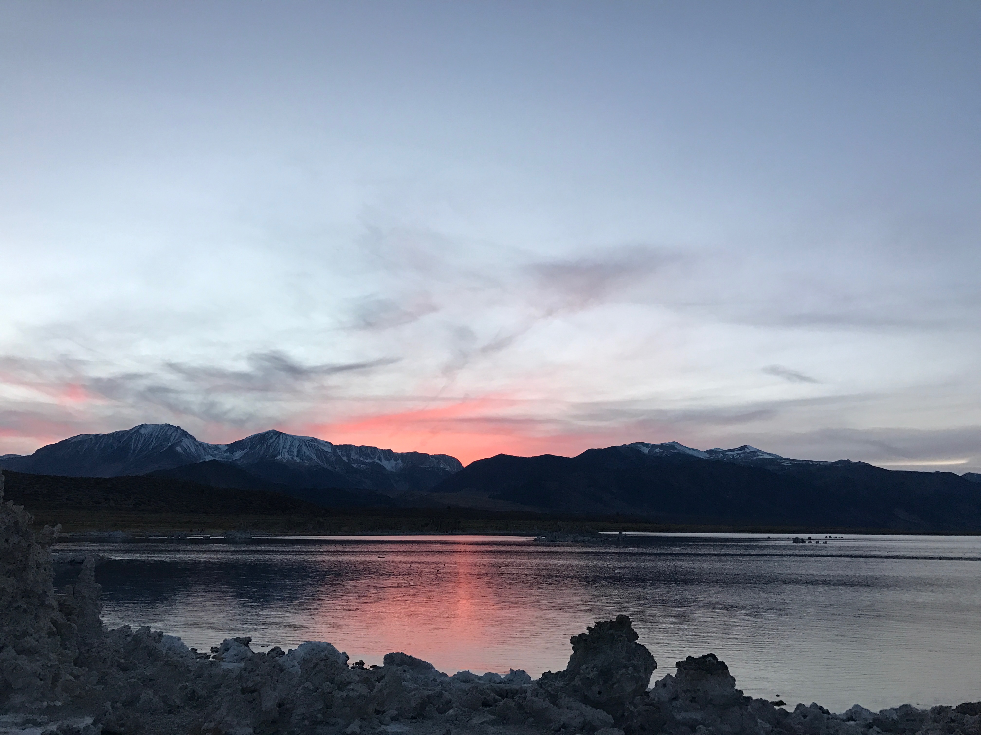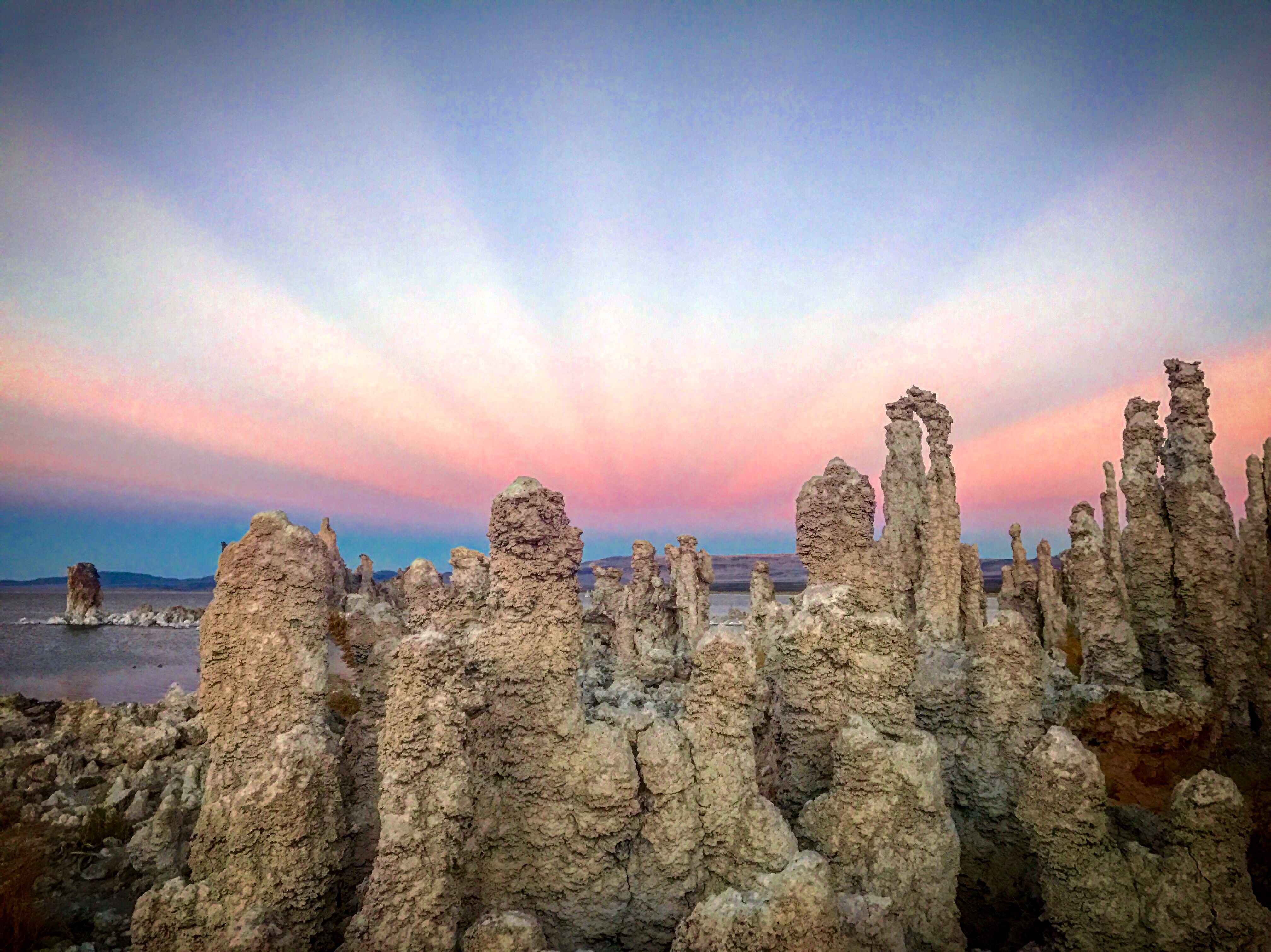 After a lot of oohs and awes (nice one eh?), we descended down to Lee Vining and Mono Lake. Mono is pronounced Moe-Noe BTW. Mono has these things called Tufas. They are solidified formations of limestone made in a lake with three times the salinity of the Pacific. Now I could go on and on about the geologic background here… But suffice to say, and for the sake of being brief, I’ll just say … Google is your friend. The South Tufas are also where the inside cover for Pink Floyd’s ‘Wish You Were Here’ album was shot. Anyways….. We found a site to camp in the sage scrub and at night listened to the coyotes cry from less than a few dozen yards away.