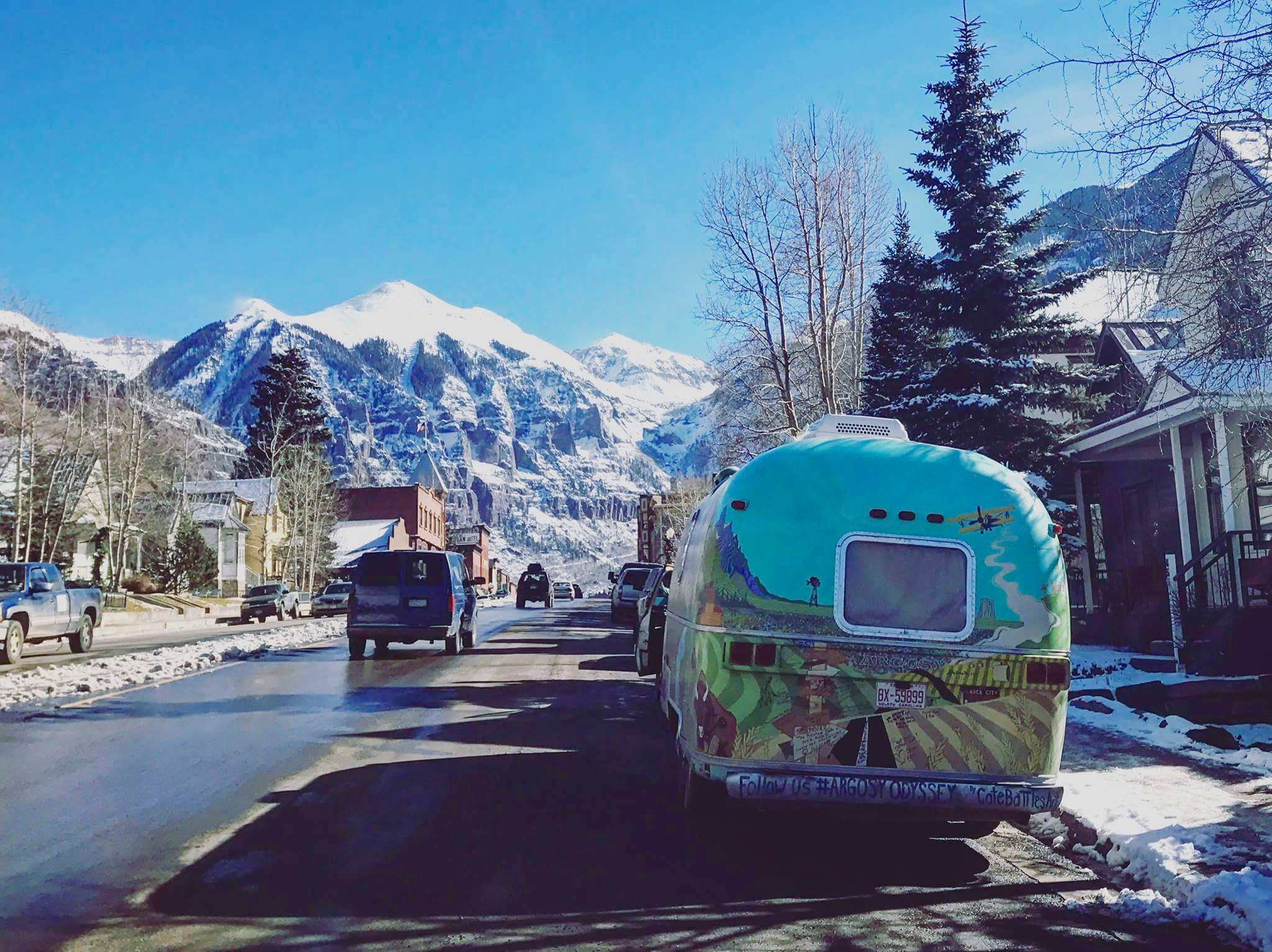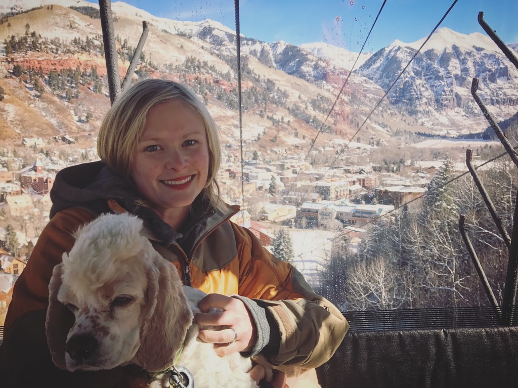 If you’re not skiing, don’t have a large budget, or it isn’t warm enough for a hike…there isn’t much to do in Telluride other than riding the AWESOME FREE GONDOLA. The gondola happens to be dog friendly! So, all three of us floated across the snowy slopes and up and over the lip of the box canyon to Mountain Village.