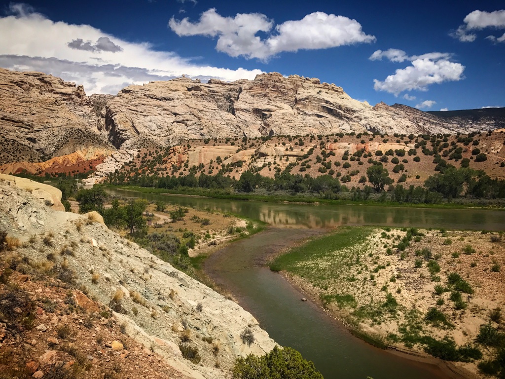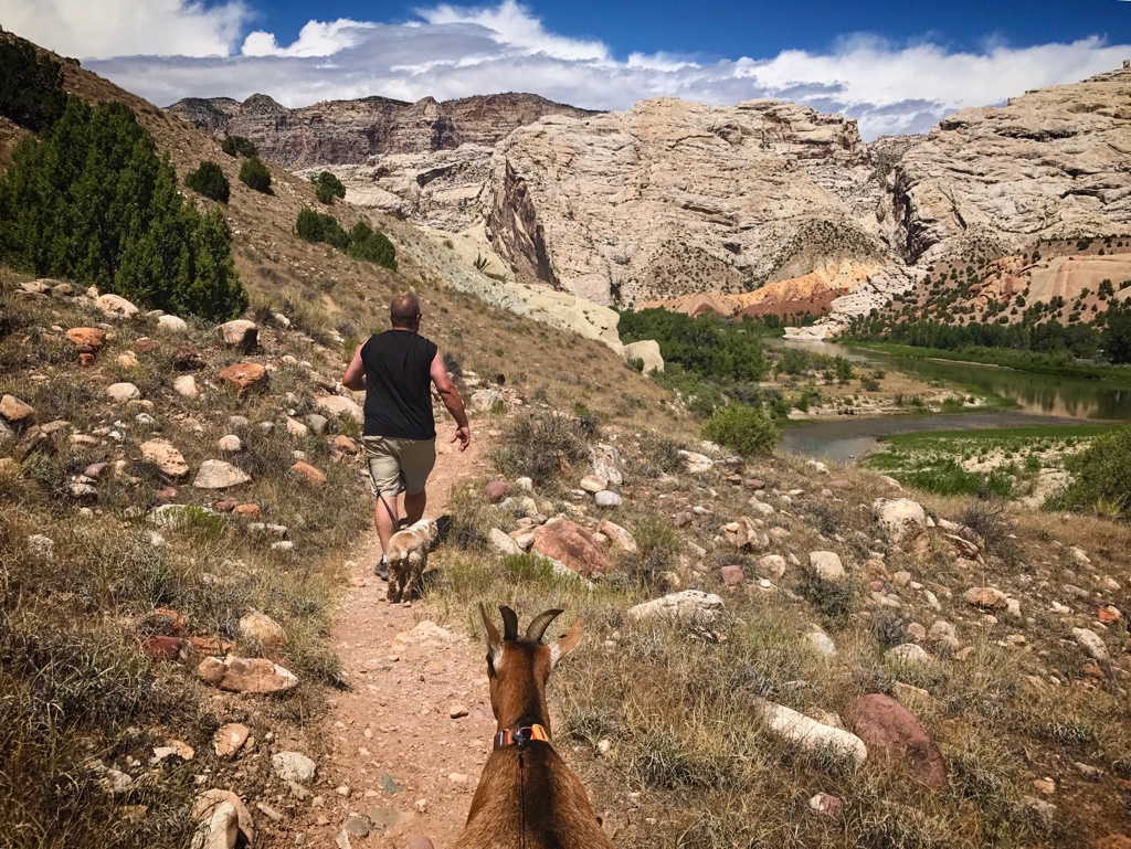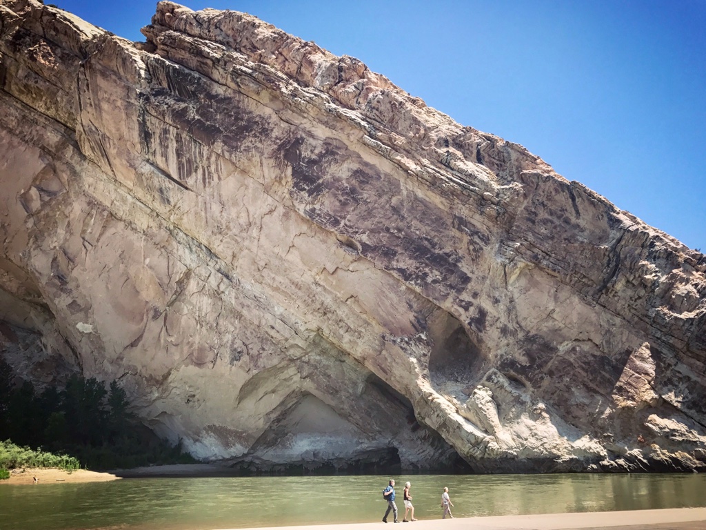 Thoroughly blown away, we dove to a different spot in the park and saw Bighorn Sheep hanging out by the water, more of Frankie’s hooved bretheren. We hiked a section of River trail (which allows pets). The animals started to get tired and we were forced to return. Beatiful rock formations lined the far side of the Green River.