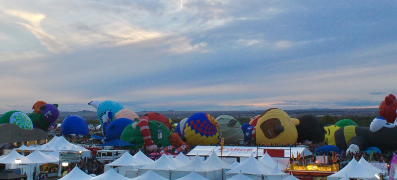 Over the next two days, Cate entertained some visitors that follow our blog, I did some solo exploring of downtown Santa Fe, and went to the Friday night glow at the Albuquerque Balloon Fiesta. The fiesta claims to be the most photographed event in the world. The night glow was fabulous, and as luck would have it, it was the Unusual Shape Glow, that had been cancelled earlier in the fiesta due to high winds! Throngs of people watched as balloons were inflated all around, and among them. Occasional blasts of flame flared up into the growing balloons shaped like bumblebees, stagecoaches, Darth Vader , Yoda, Vincent Van Gogh’s head, and many more. Much too soon the balloons began to deflate, the crowds boarded the seemingly endless line of school busses to be shuttled back to their park and rides. While I waited on Cate to swing by and pick me up, the parachutists glided through the night sky releasing fireworks as they went, and the laser light show was in full effect.